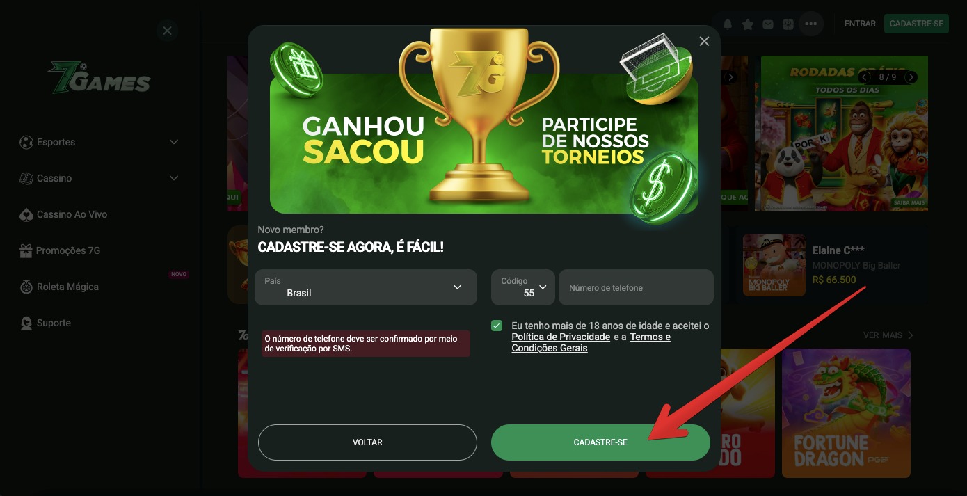 - Depois, informe seu número de celular, aceite os termos e condições da 7Games Bet e finalize clicando em “Cadastre-se”.