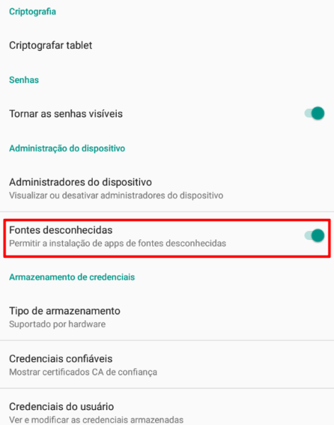 - Nesta parte, você vai ativar a opção “fontes desconhecidas”. Este passo é super importante, pois trata-se de uma autorização para fazer download fora da loja oficial do sistema Android, que é a Play Store;