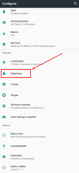 - Caso seu celular seja Android é importante que você acesse as “Configurações” de seu aparelho e, depois, a opção “Segurança”;