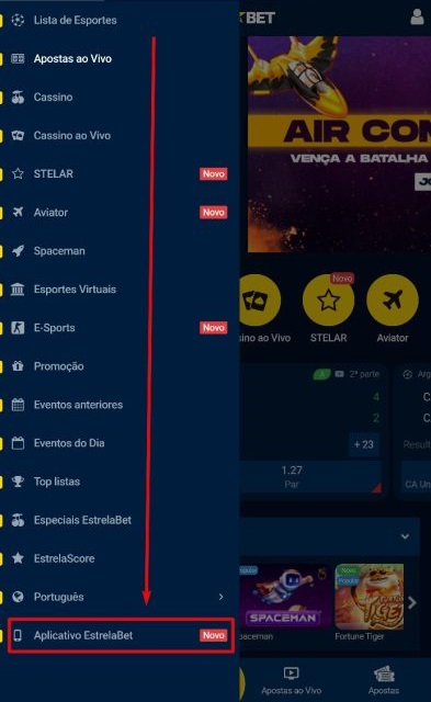 - Neste momento, vai abrir um menu no canto esquerdo da página. Você irá descer a barra de rolagem até o final, onde encontrará a opção “Aplicativo Estrela Bet”;