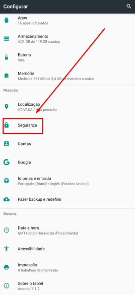 - Vá até as “Configurações” de seu celular e encontre a seção “Segurança”;