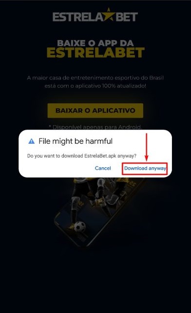 - Neste momento, o seu smartphone vai te perguntar algo sobre você autorizar o download em seu celular, dando a seguinte mensagem: “quer fazer o download de Estrela Bet apk mesmo assim?” ou, então “Quer instalar este aplicativo?”. Não se preocupe com esses termos e vá em frente, pois o site é seguro;