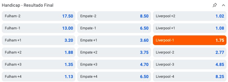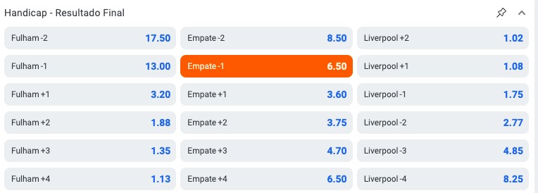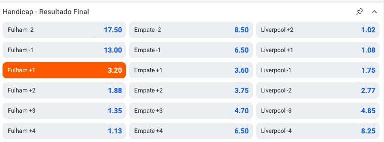 - Fulham (+1). A equipe da casa começa com um gol de vantagem e precisa vencer ou empatar para que a aposta seja vencedora.